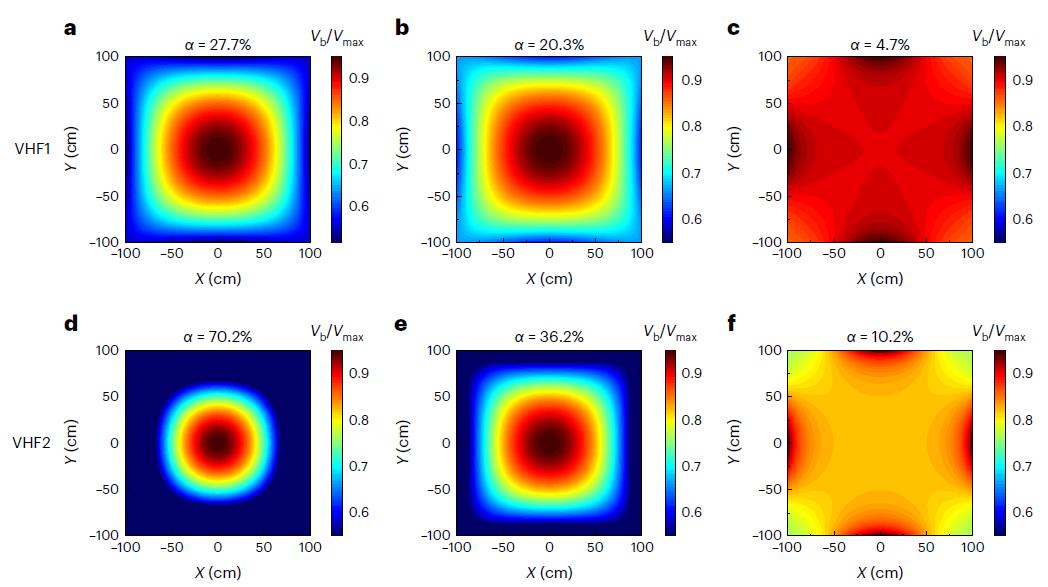 1. 开发了一种基于甚高频(27 MHz,VHF1)的大面积(2.03*2.03 m2)nc-SiOx:H(n)窗口层PECVD沉积系统。与甚高频(40 MHz, VHF2)相比,VHF1在大尺寸腔体中将驻波效应降至最低,表现出更优异的薄膜厚度均匀性和电池效率分布均匀性。