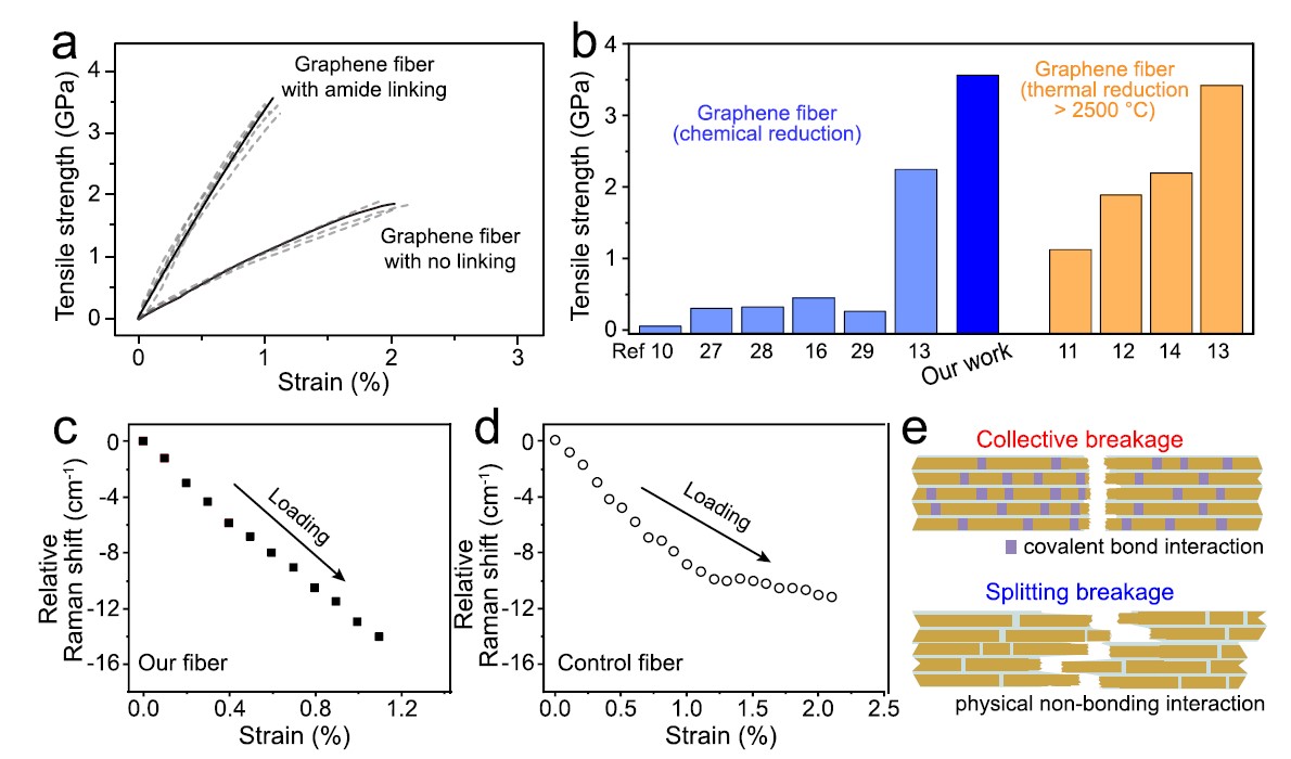 近日,耿凤霞教授课题组开发了一种通过酰胺反应桥接石墨烯片的新策略,显著提升了石墨烯纤维的机械性能和导电性能。该研究为石墨烯纤维的制备提供了新思路,并为其在多种高端应用中的实际应用奠定了基础。